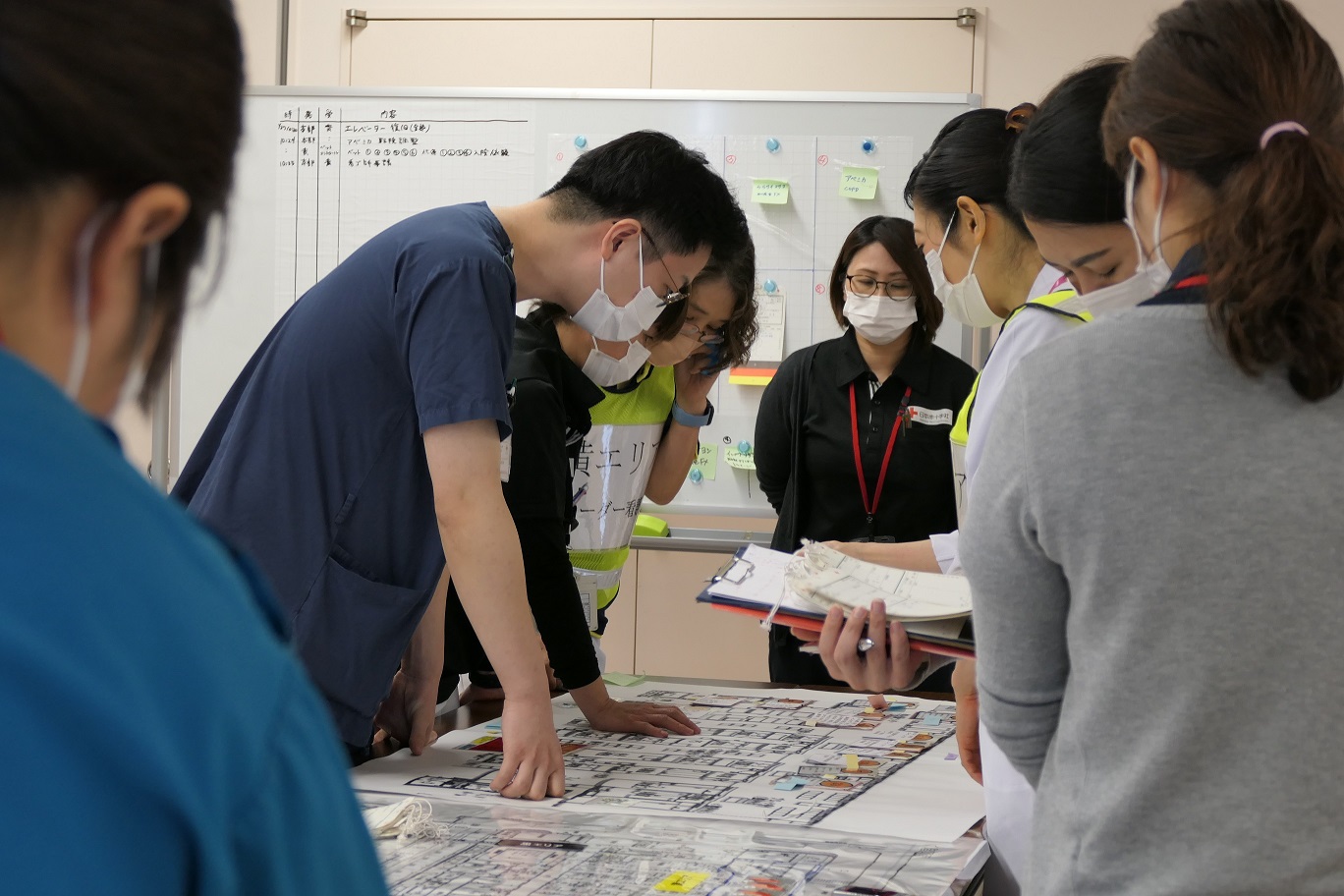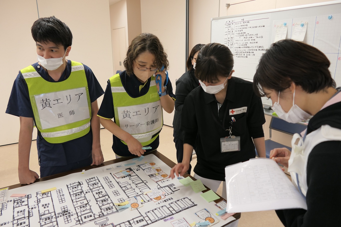 院内訓練では災害本部を設置し、病院機能維持や多数傷病者の受け入れ、入院患者さんへの対応などを訓練しました。